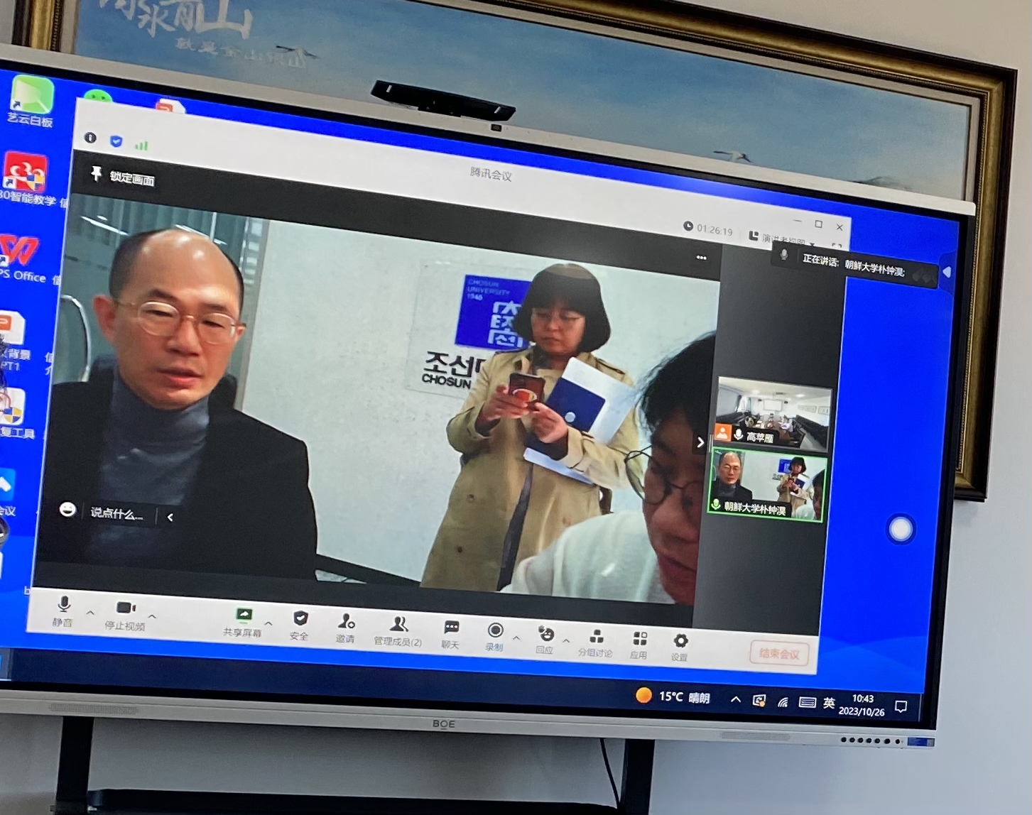 10月26日,我院与韩国朝鲜大学进行了线上友好合作会谈。朝鲜大学出席代表为对外合作处处长孔真圣、国际交流部部长闵敬慧及主任朴钟淏,我院出席代表为继续教育与国际合作交流学院院长王忠泽、副院长周鋆、朱震陽等。
